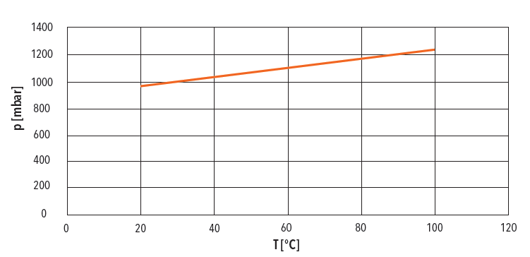 Также необходимо учитывать нагрев датчика давления и, следовательно, расширение воздуха внутри датчика. Воздух, находящийся внутри передатчика, расширяется при повышении температуры. Однако, если корпус герметичен, давление внутри увеличивается, и это заставляет его давить на измерительную мембрану. На графике, основанном на уравнении идеального газа, показано, как давление внутри корпуса увеличивается, как только захваченный воздух нагревается. Чтобы предотвратить это повышение давления, захваченный воздух должен либо выходить наружу, либо иметь возможность свободно расширяться в одном направлении.